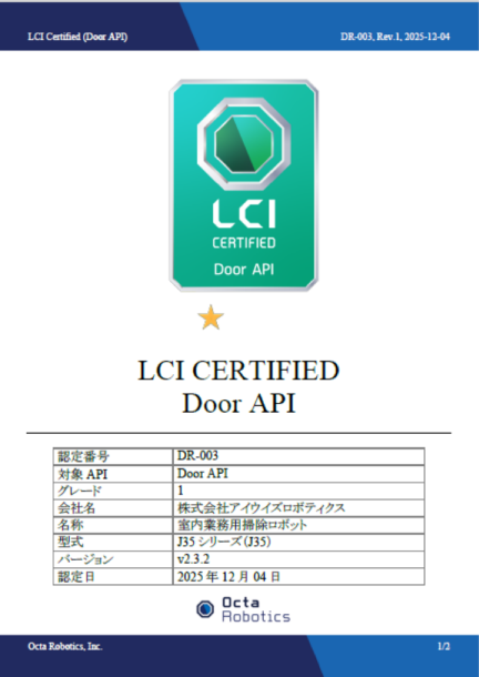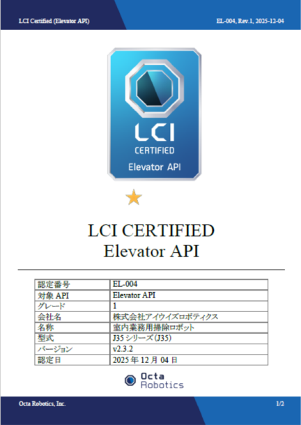 株式会社アイウイズロボティクス(本社:東京都品川区、代表取締役CEO:王 馳)は、株式会社Octa Roboticsが提供する LCI認定プログラムにおいて、当社室内業務用掃除ロボットJ35が